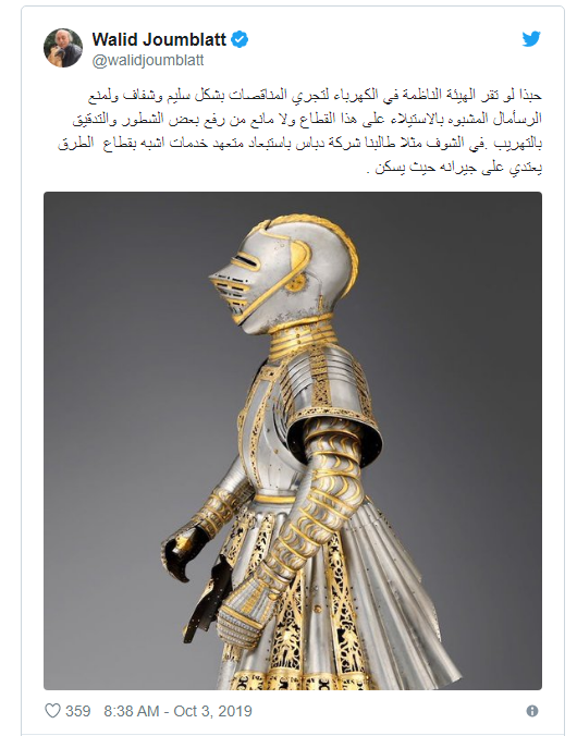 غرد رئيس الحزب التقدمي الإشتراكي وليد جنبلاط عبر تويتر قائلا :"حبذا لو تقر الهيئة الناظمة في الكهرباء لتجري المناقصات بشكل سليم وشفاف ولمنع الرسأمال المشبوه بالاستيلاء على هذا القطاع ولا مانع من رفع بعض الشطور والتدقيق بالتهريب. في الشوف مثلا طالبنا شركة دباس باستبعاد متعهد خدمات اشبه بقطاع الطرق يعتدي على جيرانه حيث يسكن."